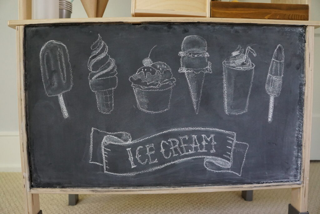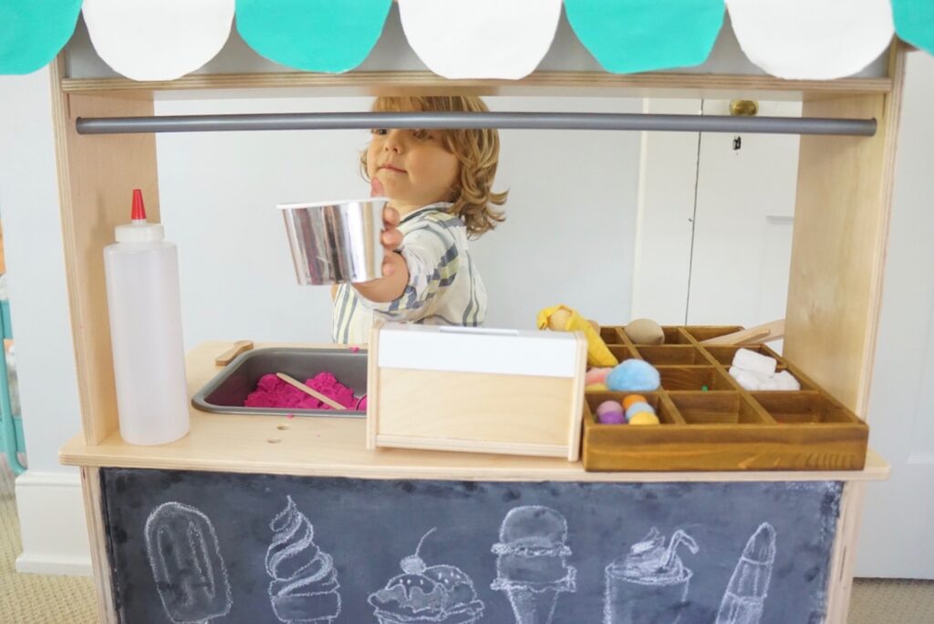 The toy cash register from IKEA is perfect for dramatic play. Stock your ice cream shop with cups, cardboard cones, pretend toppings or some cool wooden ice cream toys. We used the ice cream shop with a TINKER TRAY and pink kinetic sand.